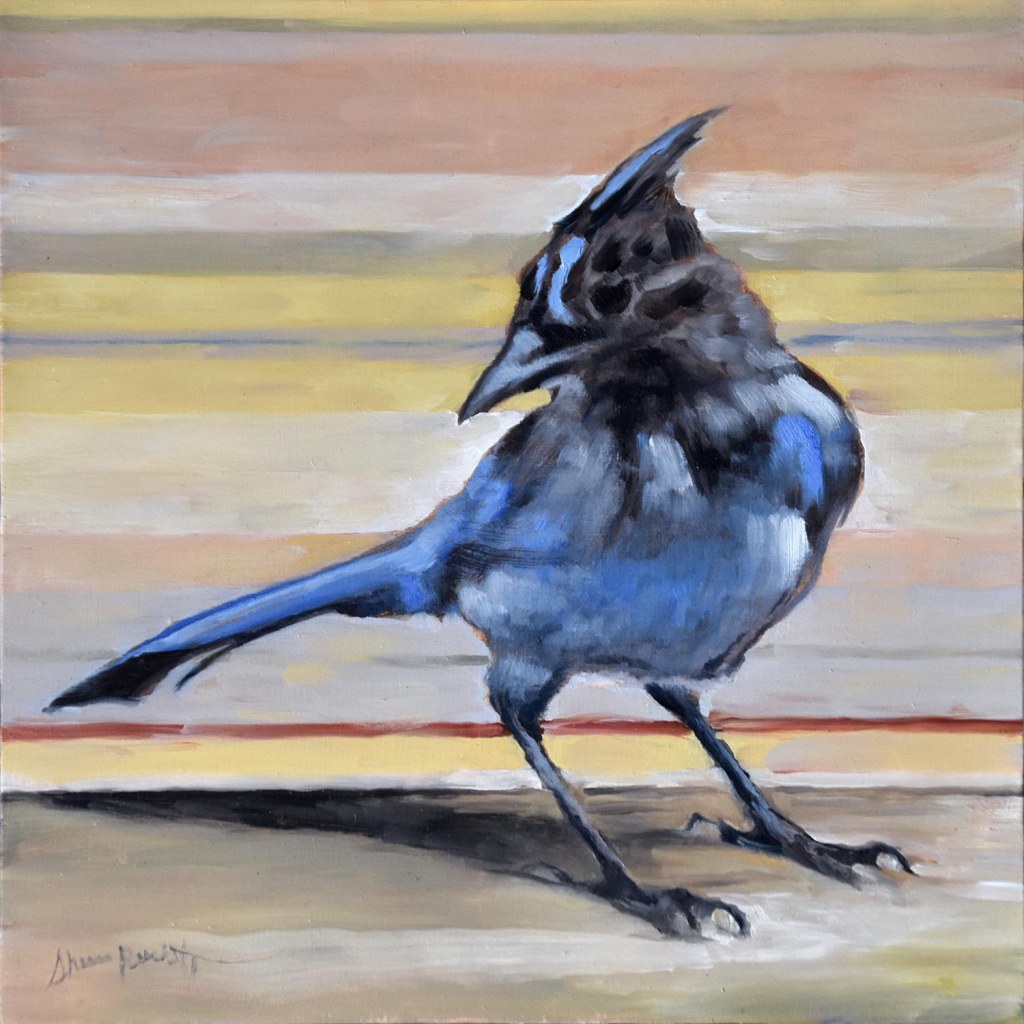 Steller’s Jay. Oil on wood. 8×8 in.