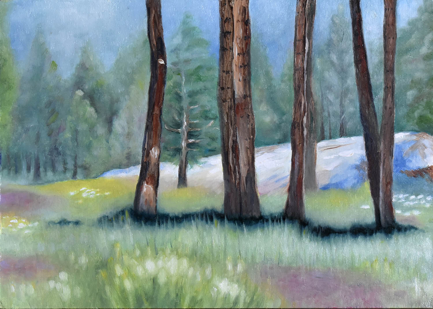 Dinkey Creek Meadow available Dinkey Creek Meadow. Oil on wood. 5×7 in. $150 Plein air oil painting of meadow near Dinkey Creek. 3/16″ wood panel. Unframed. Related