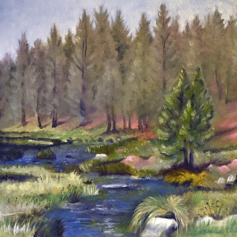 Plein air oil painting of the view from camp in Inyo National Forest. I painted this alla prima, following the shade. I worked on the mountains in the morning, then moved directly under the one tree in the afternoon. The wind picked up with intense gusts, during which I had to close my eyes against all the sand blowing into my face, while grit stuck to the wet mountains. 3/16″ wood panel.